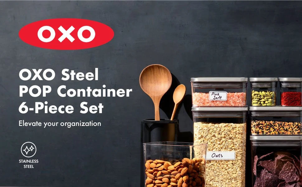 The OXO Steel POP Container 6-Piece Set is an elevated and space-efficient solution for keeping dry foods fresh and kitchens organized. Push the button on the stainless steel lids to create an airtight seal; press it again to pop it up for easy opening. More shapes and sizes provide more possibilities for storing everyday must-haves like flour, sugar, coffee, cereal, oatmeal, grains, pasta and spices.
