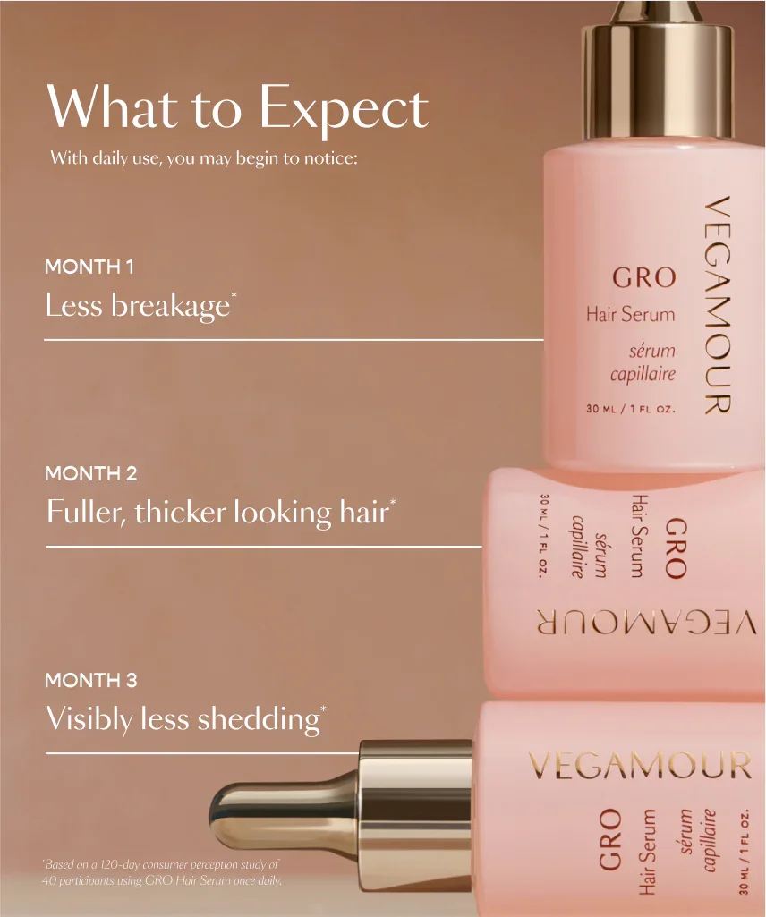 Reduce signs of shedding for thicker, fuller looking hair with our original, best-selling GRO Hair Serum. Formulated for thinning, lackluster hair, this hair serum uses plant-based phytoactives to improve overall hair wellness, soothing the scalp and increasing the appearance of hair density and thickness. Formulated with clean, vegan ingredients, and ideal to use as a daily hair wellness ritual.